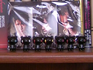 あまりにも嬉しかったので、こちらにも載せてしまいました。 本棚に並んで居る、我が家の“グルーミーちゃんズ7”。 『SISTER』会場購入の抽選でノーマルバージョン(写真向かって左側4体)をみごと引き当てました! すごいぞ、あたし!!!←自画自賛(笑) ライブはですね、下手側お立ち台前の2つ目の柵辺りで観てました。 定位置だとコータ君でさえ遠いんだけど(さすがゼップ)、お立ち台に来てくれるとやっぱ近い! アンコール後、キリトさん下手で生声挨拶してくれたんで、すごい近くで表情見ながら聞けて嬉しかった!!!(アメブロ参照) 私、キリトさんの鼻声もしかしたら初めて聞いたかもしれない(笑)。 2曲目の「ULTIMATE WORLD」だったかな?(記憶が曖昧ですが・・・) とにかく最初の方の曲で声が全然出てなくて、『あれあれ?』って思ってて喋り出したら鼻声だったわけですよ(笑)。 明らかに終始妙なテンションで、「お前ら大好き」とか言ってるし、メンバー紹介では ・タケオさん→今年の抱負と好きな食べ物 (バスドラをキックして、「今年もドコドコ言わせてやる」って言ってたかと。好きな食べ物の事すっかり忘れてるのかと思ってたら、最後締めで「プリンが好きだ~」って言ってたよ(笑)) ・コータくん→今年の抱負と好きな歴史の人 (抱負は忘れましたが(汗)、好きな偉人は「織田信長」だそうで、中身に反して肖像画を見ると見た目が弱々しそうでそのギャップが好きだ、みたいな事を言ってた) ・トールさん→今年の抱負と好きなフルーツ (ブログを更新したんだけど、1/1中に更新しようと思って部屋に時計がないから携帯の時計を見ながら一生懸命打ってて、23:59頃とかにギリギリ間に合ったと思って送信ボタンを押したんだけど、確認したら過ぎてて更新日が1/2になってしまった、って話をしてくれた。好きなフルーツは、グレープフルーツだそうです(笑)。) というお題を皆に課し、アンコール後の挨拶の時も「お母さんの名前を言って」とか言ってるし(笑)。 タケオさん、ちゃんと「ヤエコ」さんて言ってたよー。 コータくんとトールさんは言わなくて、キリトさんがさりげなく「ミチコ」って言ってた。 ちゃんと言うんだ、って関心しちゃった(笑)。 あとねー、メンバー紹介で、タケオさんが喋ってる時にキリトさんそでに一度引っこんで出てきたんだけど、コータくんを紹介してる時に「飴ちゃん舐めてるからカチカチ言っちゃうけどごめんねー」みたいな事言ってた。 “飴ちゃん”て!(笑) セットリストは「CREATURE」をやるやつでした。 「HALLUCINATION」を物凄く久しぶりに聴いた気がするけど、ベイホールでやってたっけかな? 「WINTER MOON」の時、コータ君の入魂ダウンピッキングを見た! 夏の横浜BLITZ以来だなぁ、注目して見たの。 やっぱかっちょ良い♪ 「白昼夢」は大好きなのでいつも頭を振ってしまってステージ見てないんだけど、気づいたらキリトさんがグニャっと曲がったマイクスタンドを持っていた( ゜_゜;) タケオさんは、下手側だとシンバルが邪魔になってほとんど見えないのね(^_^;) でも最後挨拶に来てくれた時にバッチリ見れた! タケオさんの笑顔はいつ見ても可愛い♪ キリトさんが、6日色々発表するんでお年玉を取っとくように、みたいな事を言ったんだけど、ファンが「お年玉」というワードに反応しまして。 「貰ってない。むしろあげてる方だ!」みたいな事を誰か言ったのか、空気を醸し出したのか、最終的に「今月分の給料取っといて下さい」って言い直させたという。 適当に流してあげればいいのにー、って私なんかは思うけど、そういう所アンジェラーさんてきっちりしてるのね(笑)。 いよいよ次は、追加公演&ツアーラストの渋谷AXです! 新年早々、仕事早退して参加しまーす。 人生、死んじゃったら終わりだからねー。 2009年も、誰に何と言われようが悔いの残らないように生きるぜ!!! PR