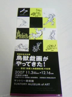 ショーGEKIという劇団の「壁を叫べ 歌を叫べ」という作品。 感想は、知り合いが出ているのであまり大きな声では言えないけど(苦笑)いまいちだったかなぁ。 大地震が起こって傾いたビルに出動したレスキュー隊とそれを指揮する指令本部のお話。 話の題材とか演出はとっても面白いと思ったんだけど、内容がちょっとどうかな、と。 せっかく遭難者が出てきていい緊迫感に包まれてどうなるんだろう?ってドキドキしてたらあっさり救出されちゃうのにはビックリした。 あとは所々に散りばめられたアメリカンジョーク的な言い回しの台詞が気になってしまい、興醒め。 ラストもねぇ、あれでいいと言えばいいのかもしれないけど、う~ん。 何か判らないけど1つ味が足らない、ってカンジが私はしました。 昨日は初日で公演期間が1週間ありますが、キャストを一部入れ替えて計4パターンで上演するそうです。 同じお話でもキャストが変わるとまた違った雰囲気になるんでしょうね。 で、この日はお芝居を観に行く前に六本木ミッドタウン内にあるサントリー美術館に行って来たんですよ。 こっちがメインと言っても過言でない(笑)。 【鳥獣人物戯画】が展示されているというので。 竜太朗くんが「あおむしドロップ」で好きだと言っていた、あの兎さんやら蛙さんやらが擬人化して描かれている絵ですね。 15時頃行ったら入場まで30分待ち。 私、美術館なんてほとんど行った事ないんで、美術ファンの人って結構居るもんなんだと驚きでした。 年齢層も幅広かったし。 人がたくさんでゆっくり自分のペースで観られなくて残念。 やっぱり有名な甲巻がいちばん好きだと思った。 あの今にも巻物から飛び出して動き出しそうな躍動感が愛くるしい(笑)。 ちなみに会期は12月16日までだけど途中で展示替えがあって、前期は11月26日まで、後期は11月28日からだそうですよー。 そういえばグッズがたくさん売られてた模様。 私はコインロッカー(お金が戻ってくるやつ)に預けちゃってて財布を持っていなかったし、時間も無かったんでよく見なかったんだけど。 出口にあるショップでも多少は置いてあったけど、美術館内の方が種類たくさんあったんで欲しい方は荷物預けてもお財布は持って入りましょう。 ムンク展どっかでやってるんだよね。 これもぜひ見に行きたい。 負のパワーを炸裂させて描いていたというムンク。 この展示会では「叫び」のような絵だけでなく、また違ったムンクの作品も展示しているそうですが。 絵の良さとか全く判らないんだけど(笑)、ムンクの「叫び」には何だか昔から魅かれているの。 PR