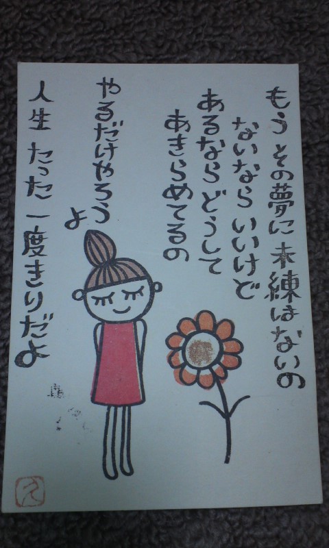 最近ずっとしてなかったけどー(´∀`) 友達からほっこりヽ(´▽`*)人(*´▽`)ノを頂きました。 ポストカード。 気にかけてくれてる人がこの世の中に居るんだぁ。 と思ったらもの凄く嬉しくて 雑貨屋さんで一目惚れして買ったそうです。 その友達自身と、私にも当てはまってると思ったので、送ってくれたとの事。 この言葉を読んだとき、「ホント、そうだよねーφ(.. )メモメモ」としか思えなかった。 完璧当てはまってる! さすがYちゃん!!! どうでもいいけど私のリアル友達、イニシャル「Yちゃん」多いな(笑) ありがとう。 私は全然だけど、Yちゃんは夢に向かってちゃんと頑張ってるよ。 今も昔も、ずっと尊敬してるんだ。 PR